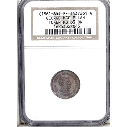 <B>(1861-65) George McClellan/One Cent Reverse, Fuld-143/261a, MS63 Brown NGC.</B></I> This glossy token has a slight blue hue over the surfaces.