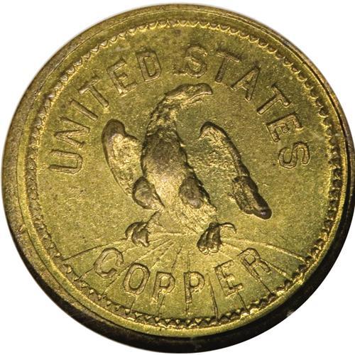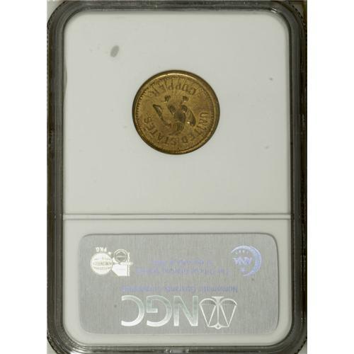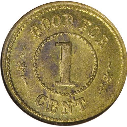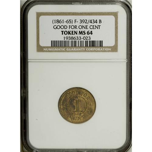 <B>(1861-65) Good For One Cent, Fuld 392/434B, R.9, MS64 NGC.</B></I> Brass. A very scarce combination of Fuld numbers makes this common-looking token a top rarity. The piece exhibits some dark areas of the obverse and a Brilliant Uncirculated reverse. Current catalog lists the value at $140 in MS60.<BR><BR><b>Shipping:</b> Coin/Currency (<a target="_blank" href="http://www.heritageauctions.com/common/shipping.php">view shipping information</a>)