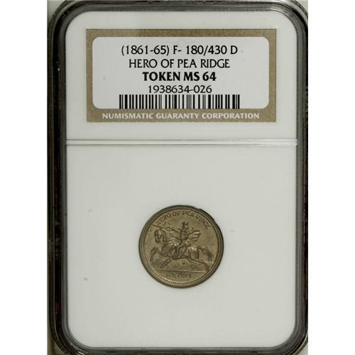 <B>(1861-65) Hero of Pea Ridge, Fuld 180/430D, R.9, MS64 NGC.</B></I> Copper-nickel. A well-struck example of this very scarce Civil War patriotic token that is listed in the Kanzinger <I>Collectors Guide.</B></I> The current catalog value in MS60 is only $175, but on this superior specimen, spirited bidding will be the order of the day.<BR><BR><b>Shipping:</b> Coin/Currency (<a target="_blank" href="http://www.heritageauctions.com/common/shipping.php">view shipping information</a>)