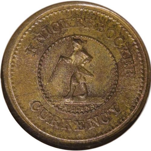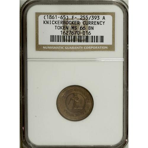 <B>(1861-65) Knickerbocker Currency, Fuld 255/393A, R.1, MS66 Brown NGC.</B></I> Copper. A superb example of a brown Premium Gem Uncirculated flawless Civil War token. While the rarity factor is common, the grade is not. A great opportunity to acquire a top-quality token.<BR><BR><b>Shipping:</b> Coin/Currency (<a target="_blank" href="http://www.heritageauctions.com/common/shipping.php">view shipping information</a>)