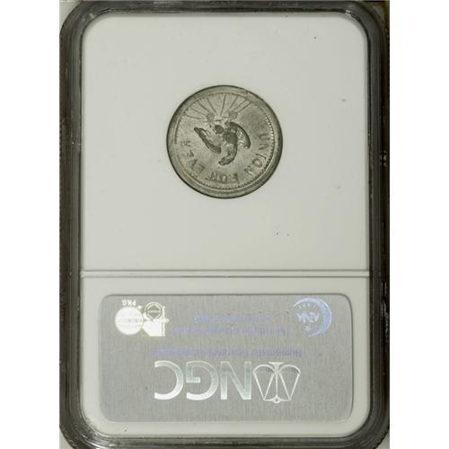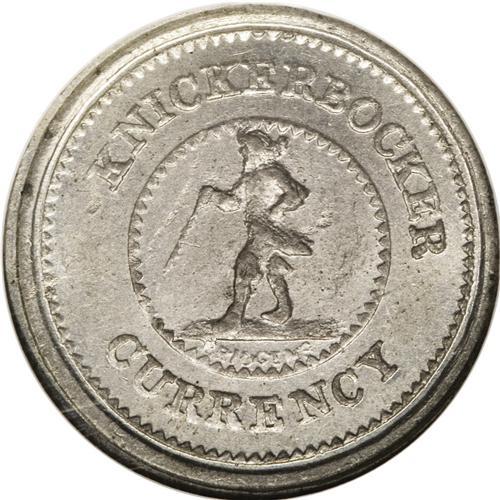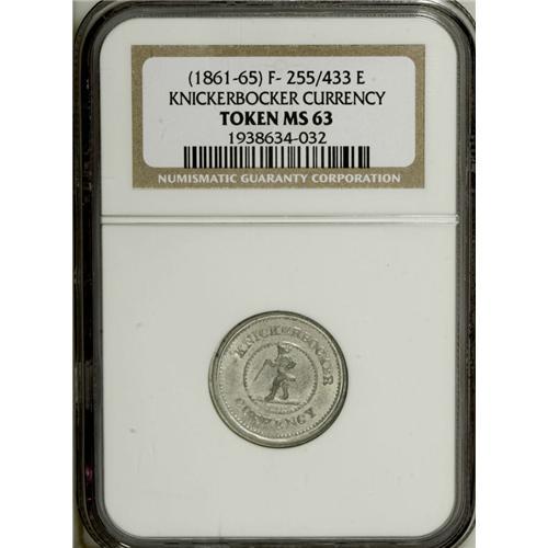 <B>(1861-65) Knickerbocker Currency, Fuld 255/433E, R.9, MS63 NGC.</B></I> White metal. While the copper version is very common, white metal pieces seem to be on the very scarce side. Listed in the <I>Civil War Token Collectors Guide</B></I> by Kanzinger and valued in MS60 at $175. The token exhibits overall great color for a white metal piece with some letters on the reverse side being recut.<BR><BR><b>Shipping:</b> Coin/Currency (<a target="_blank" href="http://www.heritageauctions.com/common/shipping.php">view shipping information</a>)