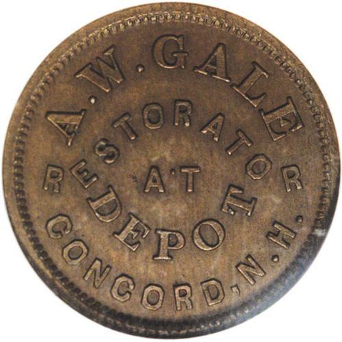 <B>(1861-65) A.W. Gale Restorator, Fuld-NH-120A-1a, R.5, Concord, NH, MS65 Brown NGC.</B></I> A second example offered here, in this case a Gem specimen of the only Civil War token issued for the state of New Hampshire. This token has an even dark-chocolate appearance.