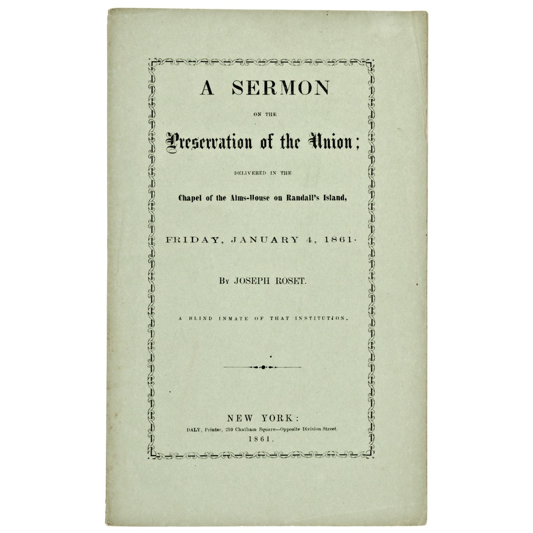 January 4, 1861-Dated Civil War period, "A SERMON ON THE Preservation of the Union..," by Joseph Roset, Printed by Daly, NY, Choice Very Fine.