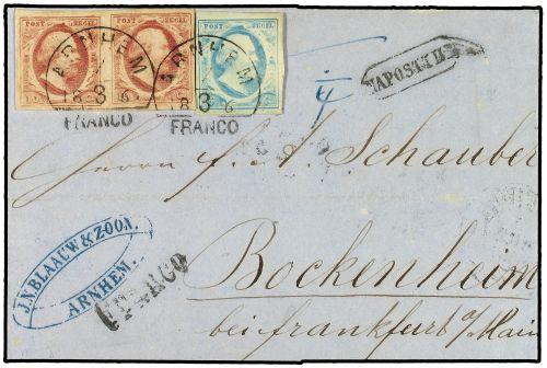 1861 ARNHEM a BOCKENHEIM (Alemania). 5 cts. azul y 10 cts. carmín (2). Sellos despegados para examen. MAGNIFICA. Cert. W. MOEIJES.