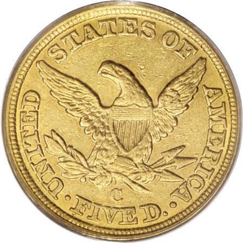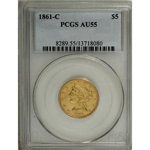 <B>1861-C $5 AU55 PCGS.</B></I> Variety 30-K. Like its Dahlonega counterpart, the 1861-C is one of the most storied and numismatically interesting of all Charlotte gold pieces. Much of the charm of this issue is derived from the fact that 887 pieces were struck after Confederate forces seized the mint. While it is impossible to determine which coins were actually struck under CSA supervision, it is generally assumed that the pieces with a die crack that connects the tops of AMERI were later strikes, and therefore produced by the Confederacy. This piece shows that die crack, and in addition there is a crack that connects the letters M and I to the rim above these letters. <BR> Much better struck than the previous two years from this mint, this piece shows strong definition on all the devices except the eagle's neck. Numerous small abrasions are peppered over each side, but none are of individual significance. Just the slightest hint of reddish patina can be seen on the surfaces. This piece is just outside the Condition Census for the issue with the finest example an MS63 from the Elrod Collection.<BR><I>From The Carolina Circle Collection.</B></I><BR><BR><B>Coin Engraver:</B> Christian Gobrecht<BR><BR><b>Shipping:</b> Coins & Currency (<a target="_blank" href="http://www.heritageauctions.com/common/shipping.php">view shipping information</a>)