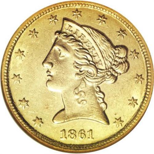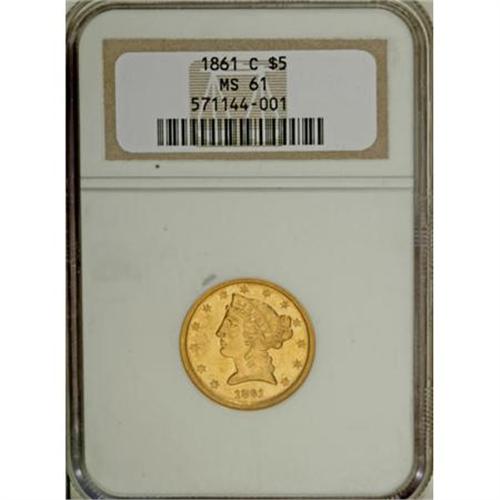<B>1861-C $5 MS61 NGC.</B></I> Variety 30-K. A rare and historic coin. As mentioned above, the "CSA coins" allegedly show die cracks through the tops of AMERI, and are struck from rusted dies, but such assertions are said to be unproven by Douglas Winter, a leading authority in the field of United States gold coins. On this piece there is a die crack from the reverse rim through the tops of ME. This is a well struck example whose only weakness is on the curls on Liberty's neck and the eagle's wing tips, and on the lower left (facing) obverse stars. A few small abrasions are peppered across each side, with the most notable ones being seen on the lower part of Liberty's neck and cheek, and in the upper reverse field. An important Mint State representative of this always sought-out issue.<BR> The 1861-C half eagle is rare in Mint State grades, occurring at a major auction perhaps once a year. As of December 2007, only nine Uncirculated specimens have been certified by NGC and PCGS combined. Examples above MS63 are unknown. Census: 5 in 61, 1 finer (11/07).<BR><I>From The Madison Collection.</B></I><BR><BR><B>Coin Engraver:</B> Christian Gobrecht<BR><BR><b>Shipping:</b> Coins & Currency (<a target="_blank" href="http://www.heritageauctions.com/common/shipping.php">view shipping information</a>)