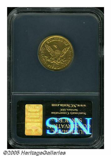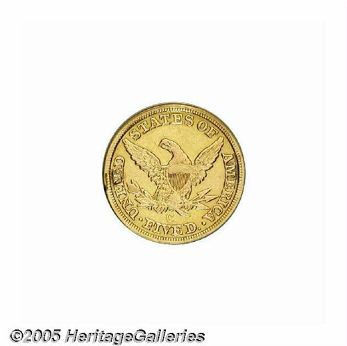 <B>1861-C<$5> XF Details, Mount Removed, NCS.</B></I> Variety 30-K. The 1861-C is a well documented C-mint Half Eagle rarity, one of just 6,879 pieces struck, that takes on added significance as the final issue produced at the Charlotte facility. Perhaps as many as 887 of these coins were delivered in May 1861. Since the Charlotte Mint had fallen into rebel hands on April 20, this last group of coins was seemingly minted under the auspices of the Confederacy. This specimen reveals bright yellow-gold surfaces with hints of light green, and a rose-pink color on portions of the reverse motif. A mount was removed from the left reverse rim area at about 9 o'clock, and the TE of UNITED re-engraved.