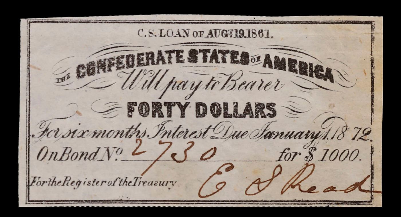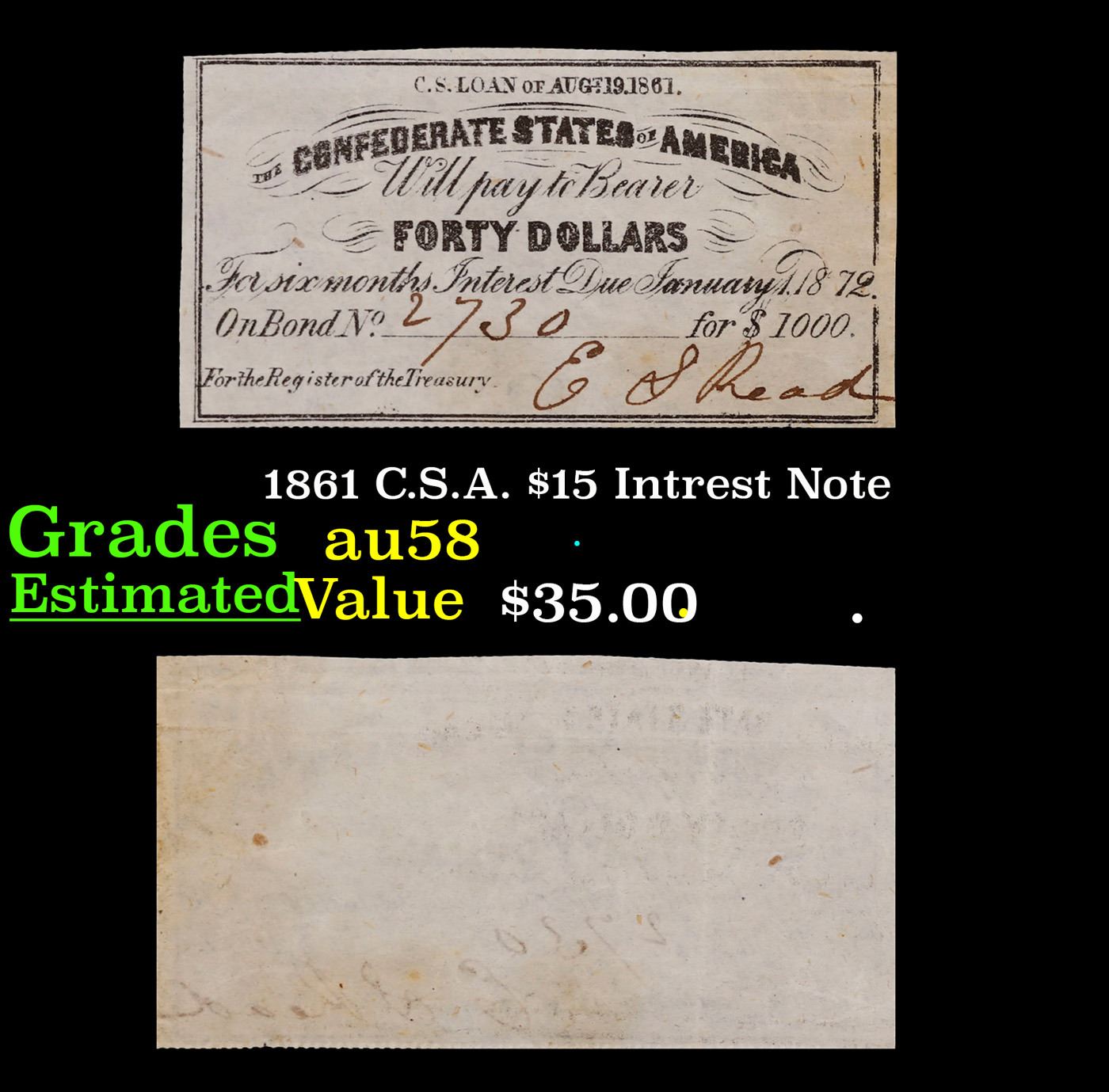 1861 C.S.A. $15 Intrest Note Grades Choice AU/BU Slider.