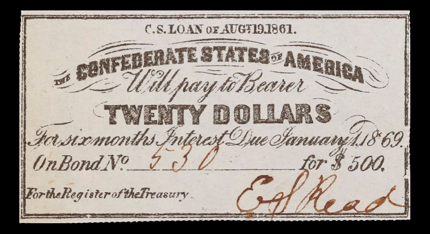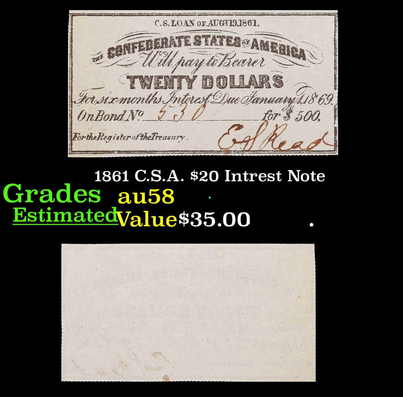 1861 C.S.A. $20 Intrest Note Grades Choice AU/BU Slider.