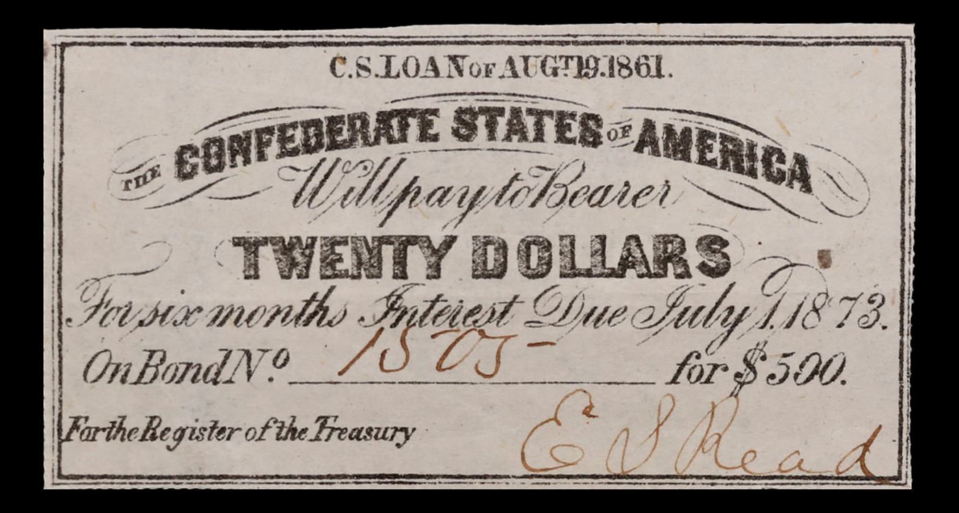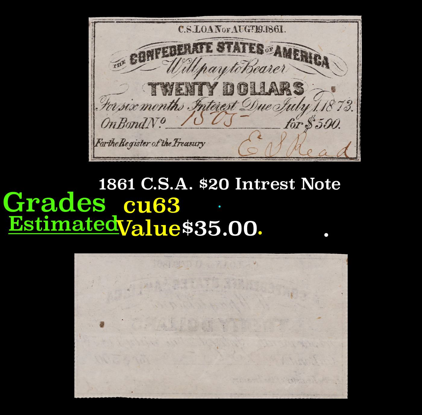 1861 C.S.A. $20 Intrest Note Grades Select CU.