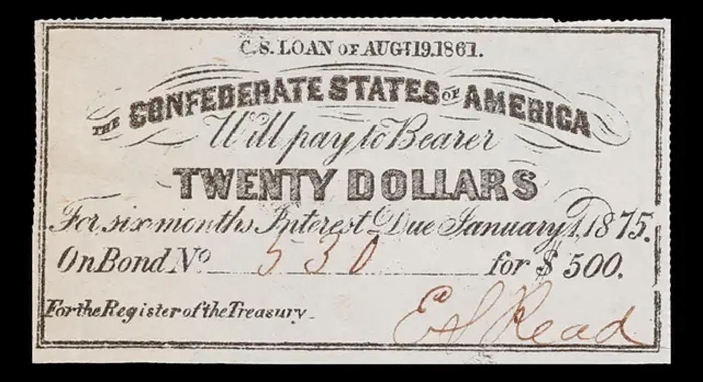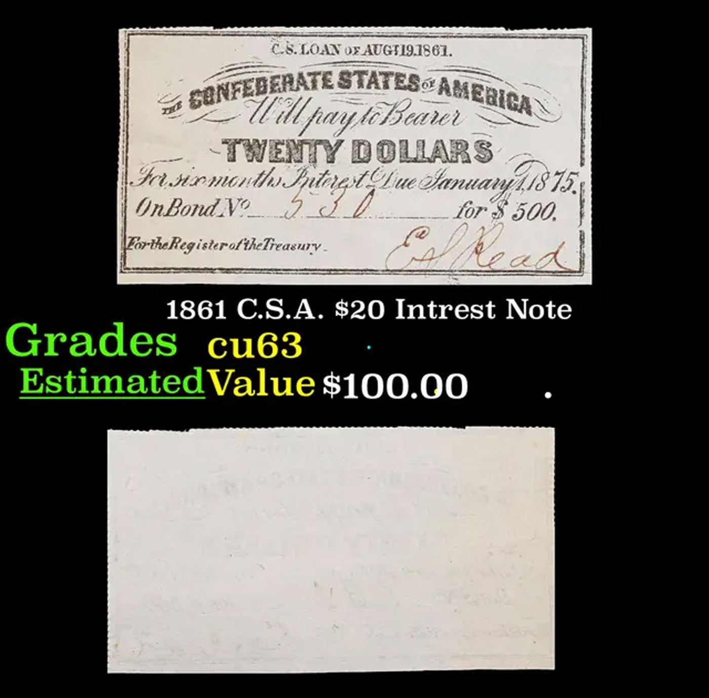 1861 C.S.A. $20 Intrest Note Grades Select CU.