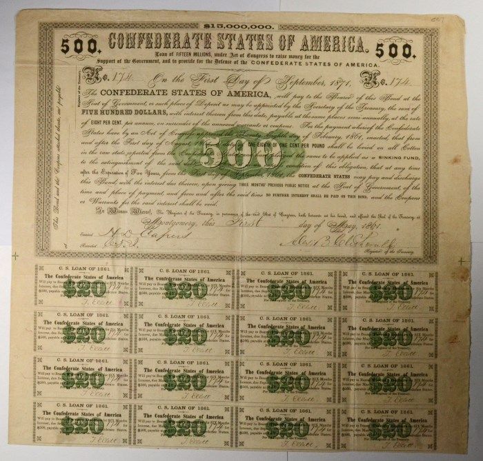 1861 CONFEDERATE STATES OF AMERICA $500 LOAN , GREEN SCROLL, VF+ 16 COUPONS
