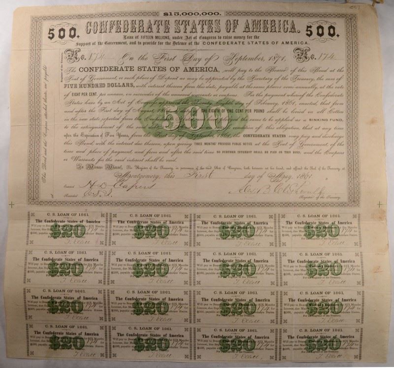 1861 CONFEDERATE STATES OF AMERICA $500 LOAN, GREEN SCROLL, VF+ 16 COUPONS