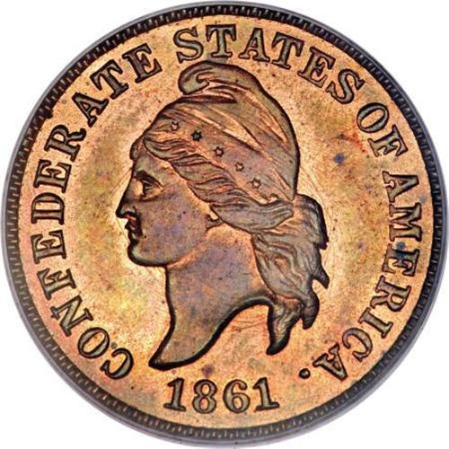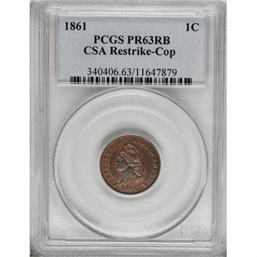 <B>1861 CSA Cent, Copper Restrike PR63 Red and Brown PCGS.</B></I> Breen-8008. In 1874, John W. Haseltine surprised the numismatic community. He had acquired the dies for the hitherto-unknown 1861 Confederate cent, engraved by prolific Philadelphia diesinker Robert Lovett, Jr. He also purchased ten original copper-nickel strikings from these dies, and made restrikes in copper, gold, and silver. According to Haseltine's April 2 advertisement, "Our intention was to strike 500 in copper, but after the 55th impression the collar burst and the dies were badly broken." Many years later, Robert Bashlow struck further restrikes, but those all show heavy die cancel marks.<BR> The present copper Haseltine restrike example is more red than brown, all the devices have mellowed with time. The surfaces are unabraded and display only microscopic carbon. Listed on page 379 of the 2008 <I>Guide Book.</B></I> Population: 2 in 63 Red and Brown, 3 finer (11/07).<BR><I>Ex: Harry W. Bass, Jr. Collection (Bowers and Merena, 5/99), lot 2075.</B></I><BR><I>From The Madison Collection.</B></I><BR><BR><b>Shipping:</b> Coins & Currency (<a target="_blank" href="http://www.heritageauctions.com/common/shipping.php">view shipping information</a>)