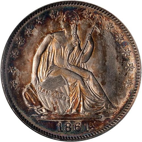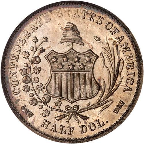 From the restrike of 1879 mintage of 500 coins. The famous restrike on an original Federal issue 1861 Half Dollar by Scott using the original Confederate Reverse Die, of which only four originals are said to have been struck during the Civil War. The host coin is a toned uncirculated coin flattened out during the restrike process. .