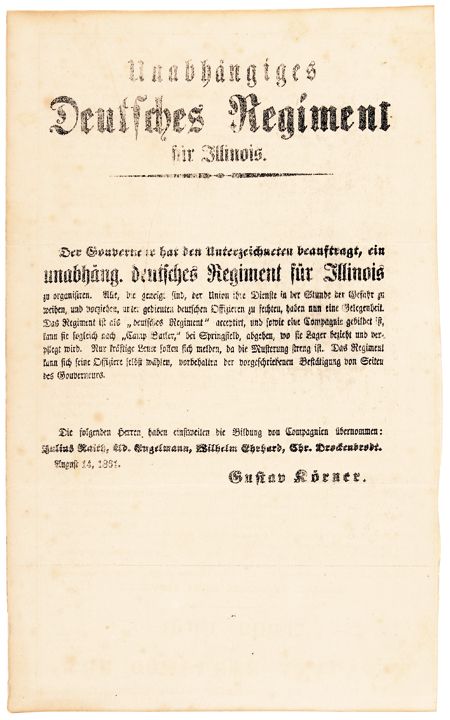 August 14, 1861-Dated Civil War Era, Printed Union Recruiting Broadside, Printed in the German Language, for Recruiting a German Regiment for the State of Illinois, Very Fine.