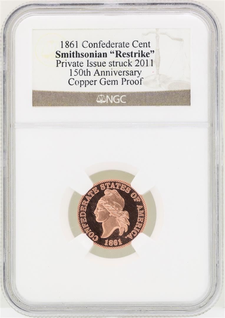 One 1861 Confederate Cent Smithsonian Restrike Copper Coin NGC Gem Proof. NGC Certified.