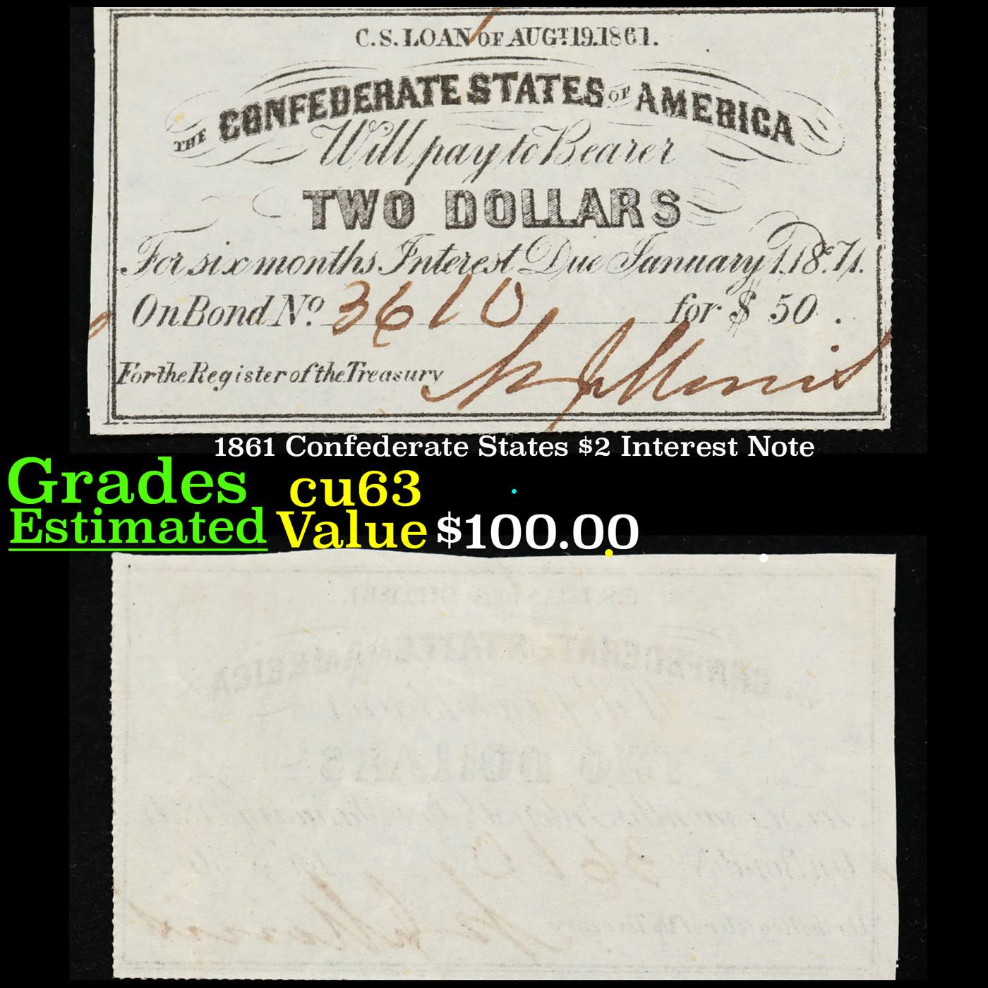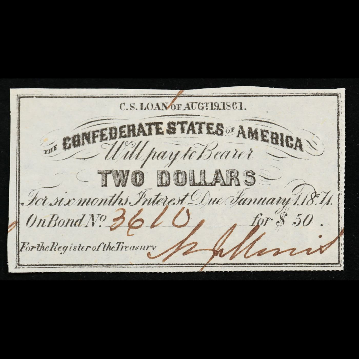 1861 Confederate States $2 Interest Note Grades Select CU. In order to fund their war effort, the newly formed Confederacy issued bonds to their citizens in 1861. These bonds included a series of coupons intended to be turned in individually for the periodic interest return on the bond, which are hand-numbered and hand-signed. These are a rare paper artifact of the Civil War.