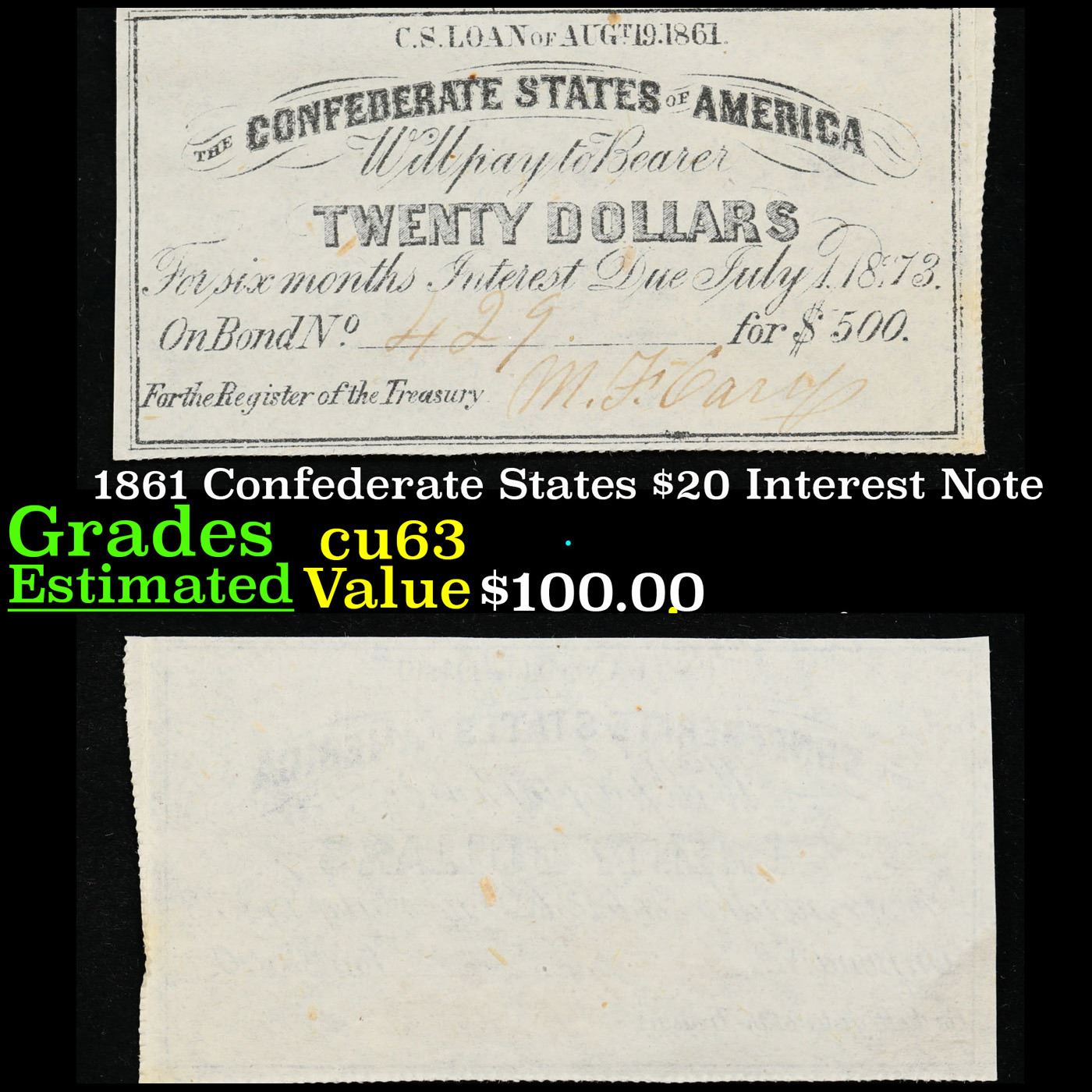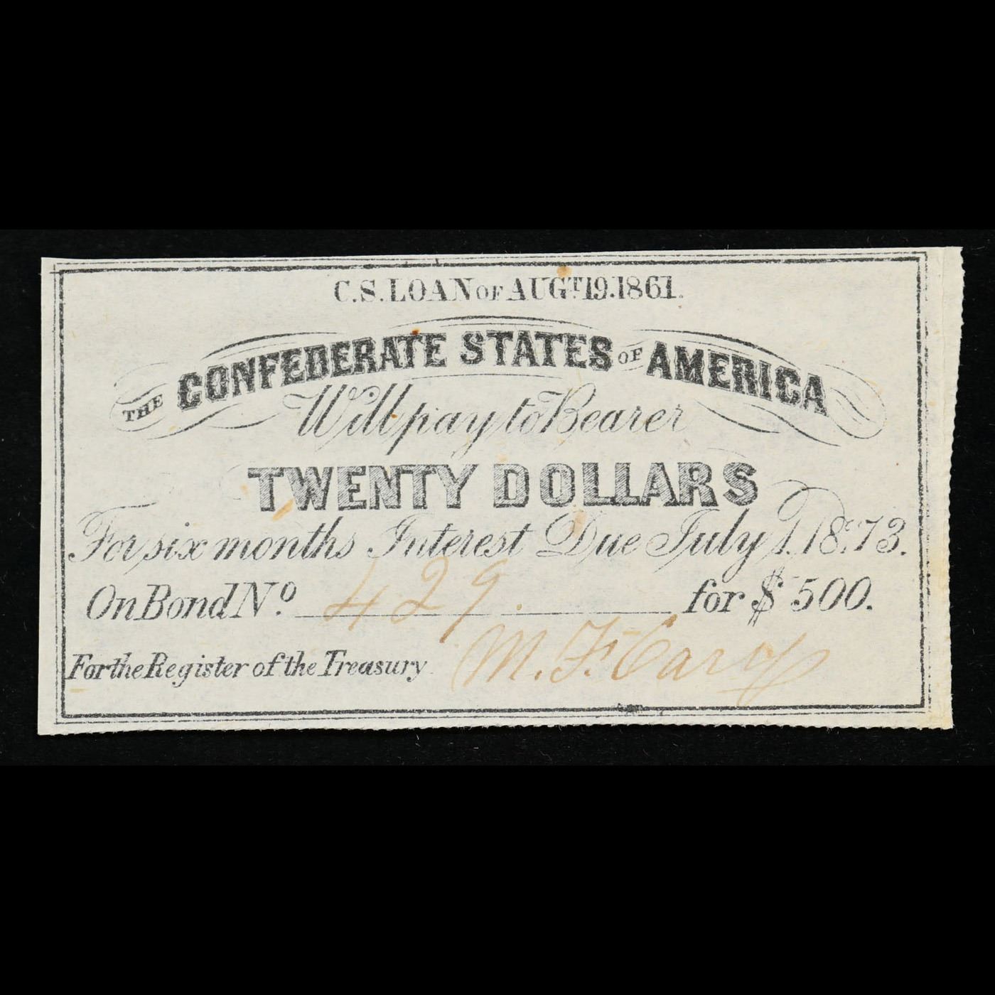 1861 Confederate States $20 Interest Note Grades Select CU. In order to fund their war effort, the newly formed Confederacy issued bonds to their citizens in 1861. These bonds included a series of coupons intended to be turned in individually for the periodic interest return on the bond, which are hand-numbered and hand-signed. These are a rare paper artifact of the Civil War.