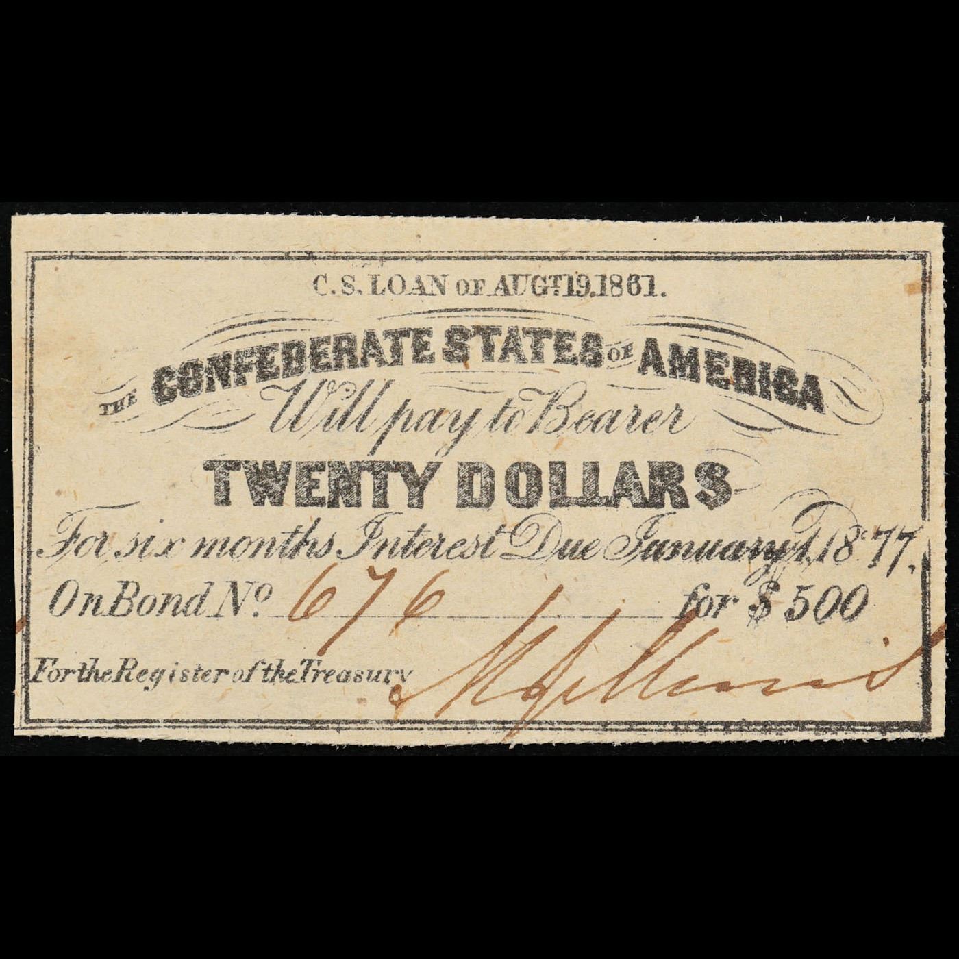 1861 Confederate States $20 Interest Note Grades Select CU. In order to fund their war effort, the newly formed Confederacy issued bonds to their citizens in 1861. These bonds included a series of coupons intended to be turned in individually for the periodic interest return on the bond, which are hand-numbered and hand-signed. These are a rare paper artifact of the Civil War.