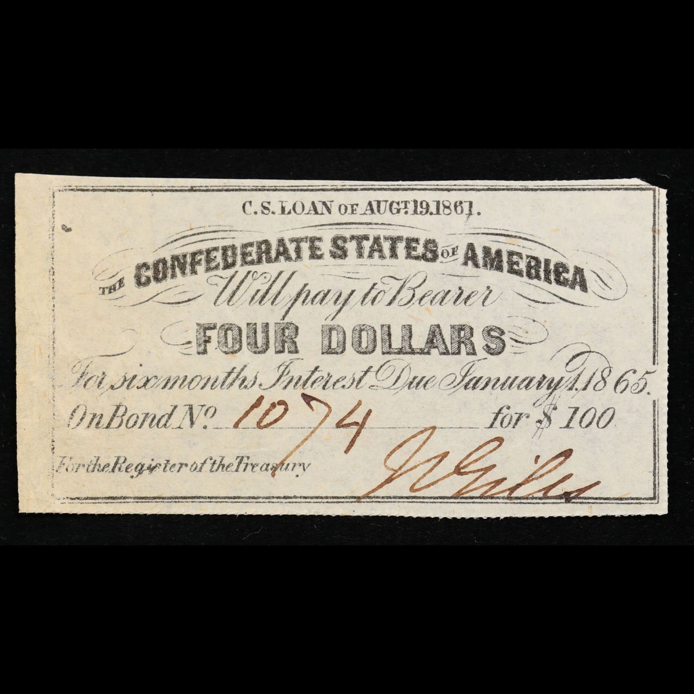 1861 Confederate States $4 Interest Note Grades Choice AU/BU Slider. In order to fund their war effort, the newly formed Confederacy issued bonds to their citizens in 1861. These bonds included a series of coupons intended to be turned in individually for the periodic interest return on the bond, which are hand-numbered and hand-signed. These are a rare paper artifact of the Civil War.