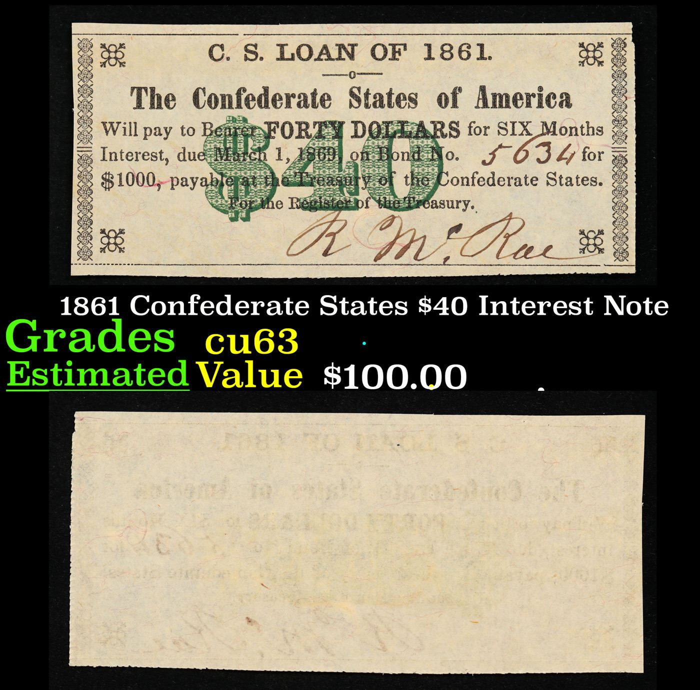 1861 Confederate States $40 Interest Note Grades Select CU. In order to fund their war effort, the newly formed Confederacy issued bonds to their citizens in 1861. These bonds included a series of coupons intended to be turned in individually for the periodic interest return on the bond, which are hand-numbered and hand-signed. These are a rare paper artifact of the Civil War.