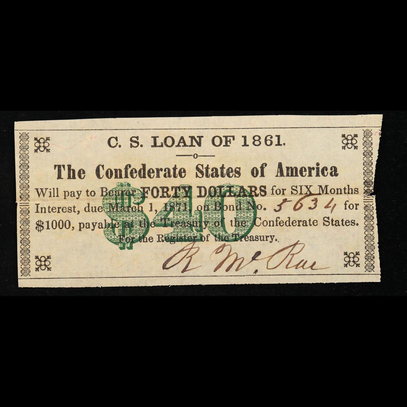 1861 Confederate States $40 Interest Note Grades Select CU. In order to fund their war effort, the newly formed Confederacy issued bonds to their citizens in 1861. These bonds included a series of coupons intended to be turned in individually for the periodic interest return on the bond, which are hand-numbered and hand-signed. These are a rare paper artifact of the Civil War.