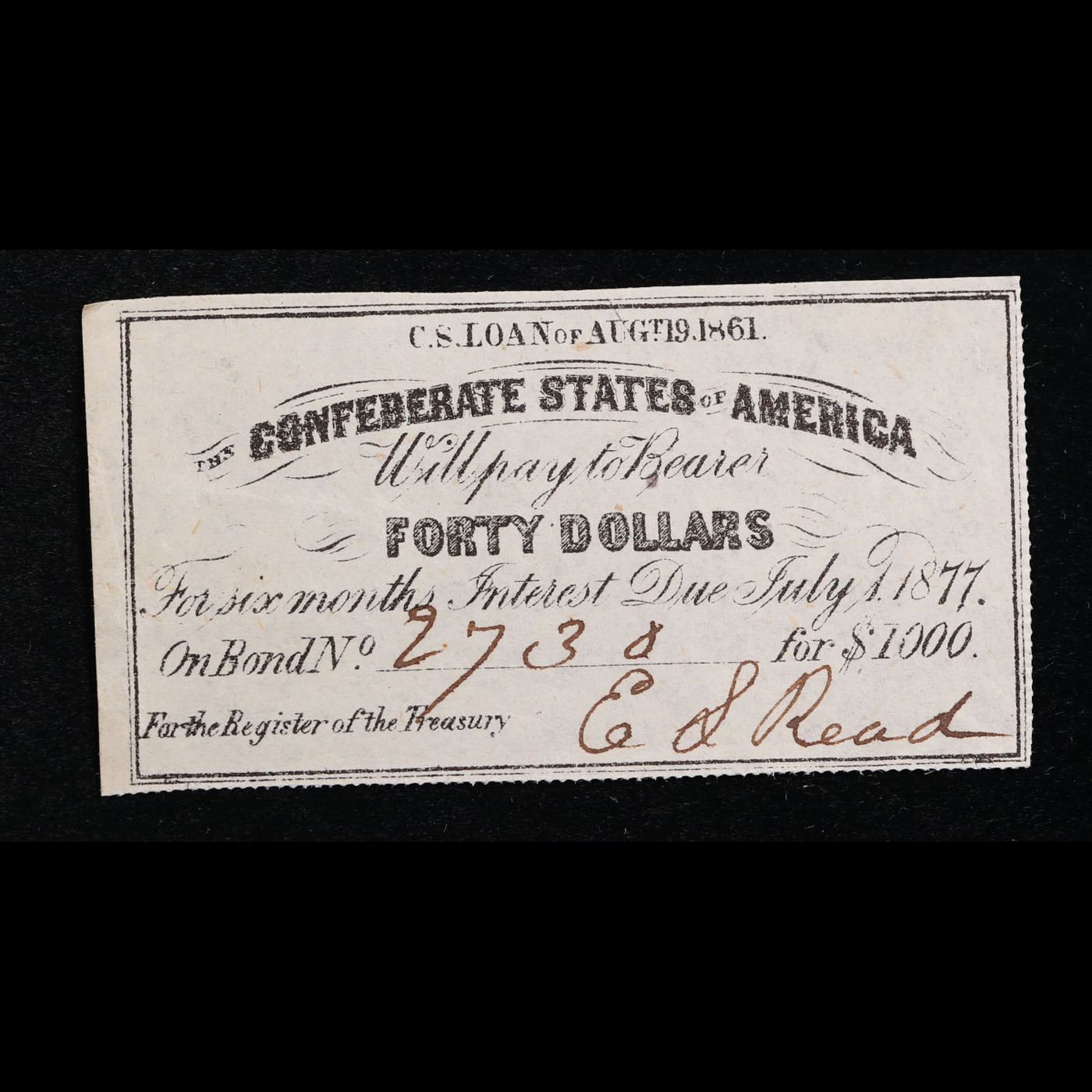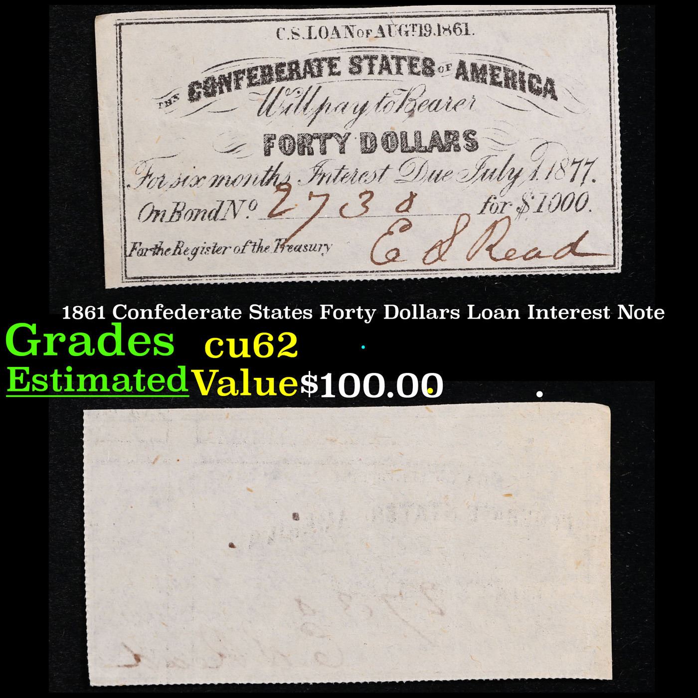 1861 Confederate States Forty Dollars Loan Interest Note Grades Select CU. In order to fund their war effort, the newly formed Confederacy issued bonds to their citizens in 1861. These bonds included a series of coupons intended to be turned in individually for the periodic interest return on the bond, which are hand-numbered and hand-signed. These are a rare paper artifact of the Civil War.