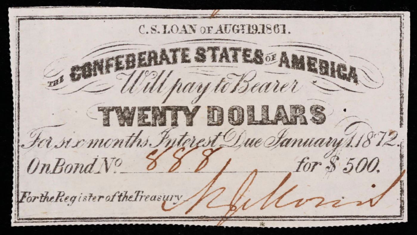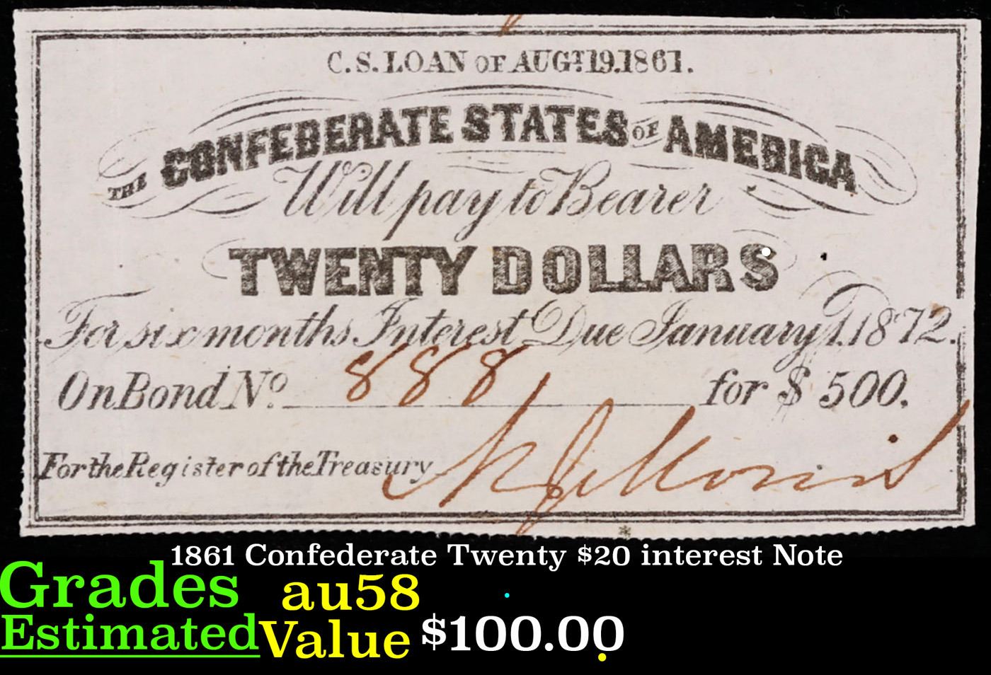 1861 Confederate Twenty $20 interest Note Grades Choice AU/BU Slider.