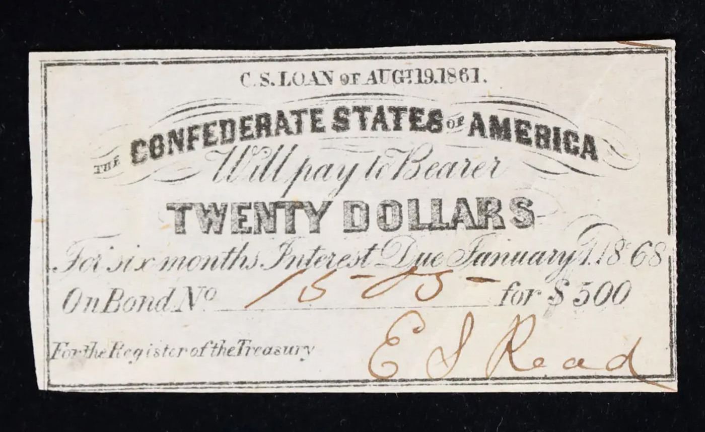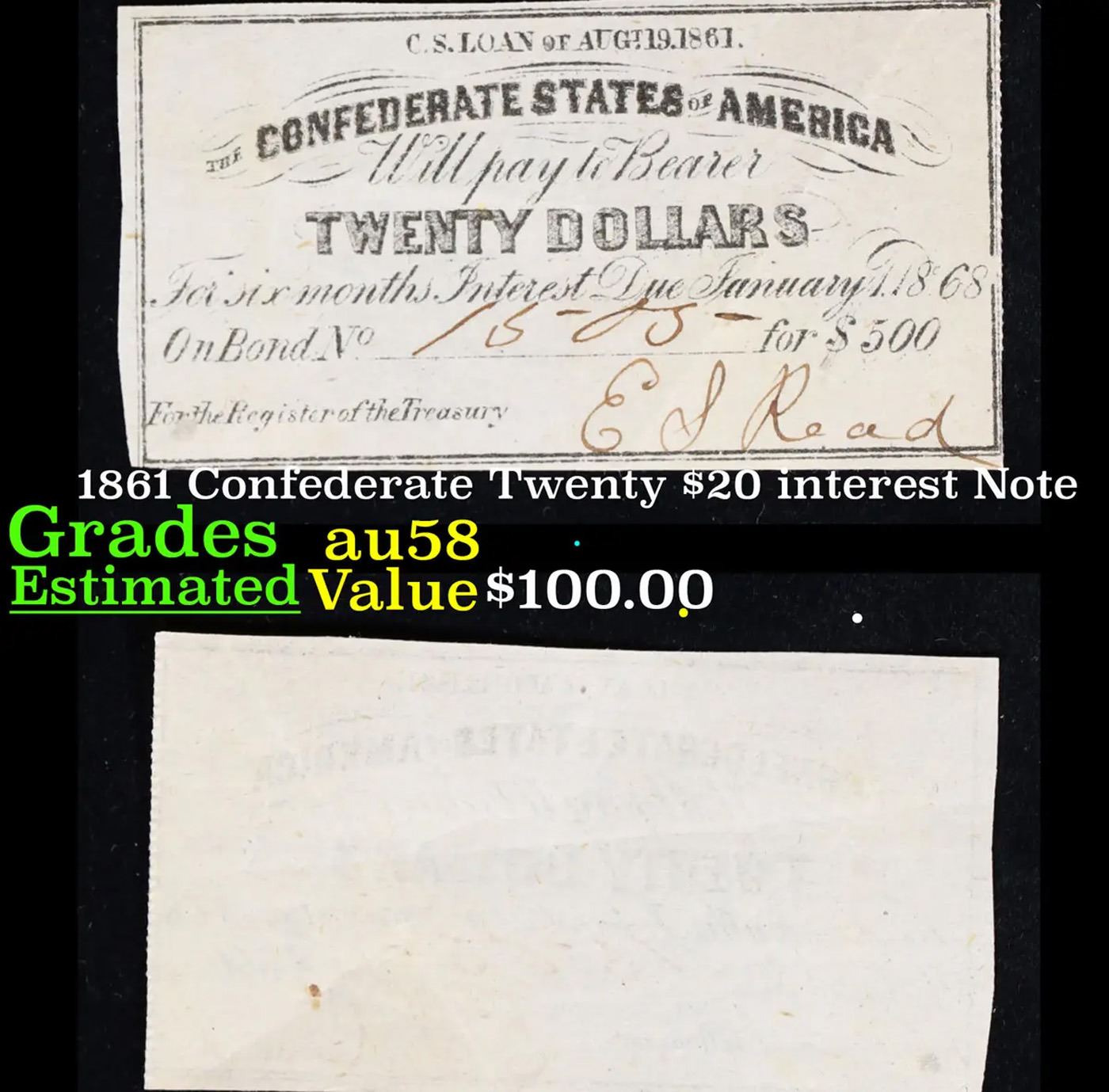 1861 Confederate Twenty $20 interest Note Grades Choice AU/BU Slider.