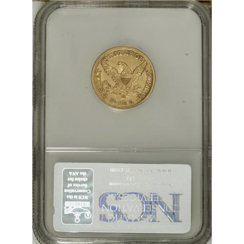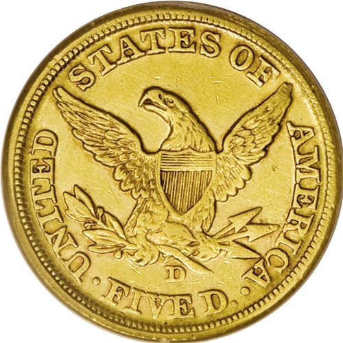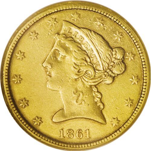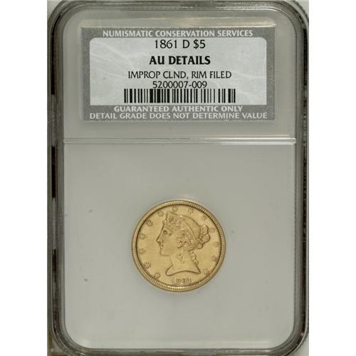<B>1861-D $5 --Improperly Cleaned, Rim Filed--NCS. AU Details.</B></I> Variety 39-EE. Only 1,597 pieces were officially struck of the 1861-D five plus an unknown number after Confederate forces seized the mint. Examples are rare in all grades with only 65-75 pieces known in all grades. Well, but certainly not fully struck, the surfaces are bright from cleaning, as stated on the insert. We do not doubt that the rim has been filed also, but cannot see evidence of it in the holder--it may be obscured by the plastic lip that holds in the coin. Deep reddish tinged patina.<BR><I>From The Twin Hollows Collection.</B></I><BR><BR><b>Shipping:</b> Coin/Currency (<a target="_blank" href="http://www.heritageauctions.com/common/shipping.php">view shipping information</a>)