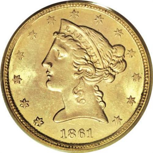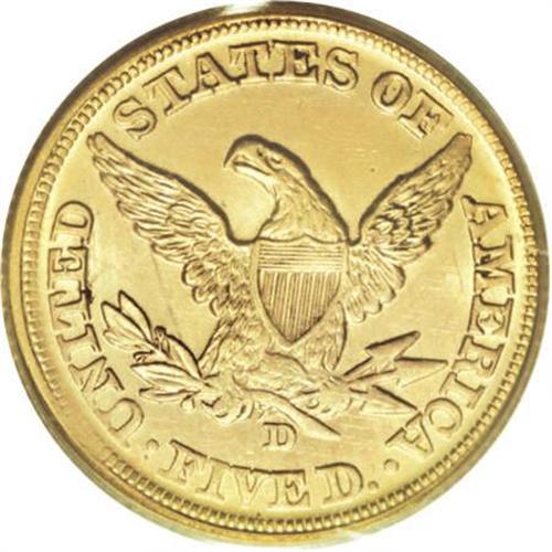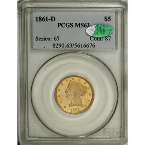 <B>1861-D $5 MS63 PCGS. CAC.</B></I> Variety 39-FF. This is the first time this phenomenal coin has been offered at public auction. It has been known to a few specialists for 10 years or so, but has only traded hands through private transactions. Somewhere between 2,500 and 3,500 pieces were struck of the 1861-D five with perhaps 65-75 examples known today in all grades. The other MS63 was also in the Duke's Creek Collection, but this piece is positioned at the top of the roster of the finest pieces known. This coin received a full paragraph in Doug Winter's <I>Gold Coins of the Dahlonega Mint, 1838-1861</B></I>:<BR> <BR> "To the best of my knowledge, an 1861-D half eagle was the first Dahlonega gold coin to sell for more than $100,000. In 1997, Heritage Rare Coin Galleries and I paid a six-figure price for a superb 1861-D half eagle that was later graded Mint State-63 by PCGS. It was quickly sold to Hancock and Harwell who then placed it in the Duke's Creek collection. Considering that this is the finest known example of the most desirable Dahlonega half eagle, its record price is well-deserved."<BR><BR> There are two distinct striking periods for the 1861-D and each has its own merits. The first period, represented by this coin, was allegedly struck under federal authority. These pieces, believed to have been struck between January and April 1861 are identifiable by a better quality strike and proper alignment of the dies. After the mint was seized by Confederate forces on April 8, the coins tend to take on a more crude appearance and are poorly aligned. This is the general belief of specialists, but there is no way to actually determine a federal coin from one struck under CSA control. <BR> The surfaces of this piece indicate it is an early (USA) striking, if one accepts the striking sequence set forth above. The striking details are a bit soft on the highpoints of the hair above ER in LIBERTY, the obverse stars, and the eagle's claw, but elsewhere the definition is strong and the design elements show good alignment. <BR> The surfaces of this piece are phenomenal for a Dahlonega product. There are no mentionable defects on either side. The only usable pedigree identifier is a faint diagonal streak of grease that was struck into the coin at the time of production, located below the eagle's left (facing) wing and the first upper leaf on the branch below. Mint luster is always uncertain on Dahlonega and Charlotte coins because so few exist in Uncirculated grades, thus there is little opportunity to make generalized statements about luster. This coin shows a decided frosted texture with a slight semi-prooflike sheen in the fields. The color is also wonderful. It is totally original and untampered. Overall the piece has a slight reddish-gold color but there is also a lovely intermingling of lilac on each side. <BR> The well-balanced strike, clean surfaces, excellent mint luster, and original color all add up to exceptional eye appeal. Not only for a Dahlonega five, but this piece would be noteworthy if it was a Philadelphia issue from 1861. To quote Doug Winter in a phone interview about this coin: "This is certainly one of the two finest known, and it is the finest 1861-D five likely to be available on the market anytime soon." This extraordinary coin will likely set a record for a Dahlonega gold coin.<BR><I>Ex: Paul Kagin; Stuart Levine; Doug Winter/Heritage Rare Coin Galleries; Jack Hancock; Duke's Creek Collection. </B></I> <BR> <BR><BR><B>Coin Engraver:</B> Christian Gobrecht<BR><BR><b>Shipping:</b> Coins & Currency (<a target="_blank" href="http://www.heritageauctions.com/common/shipping.php">view shipping information</a>)