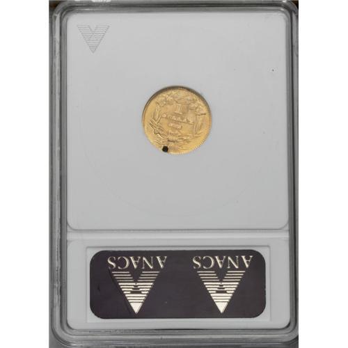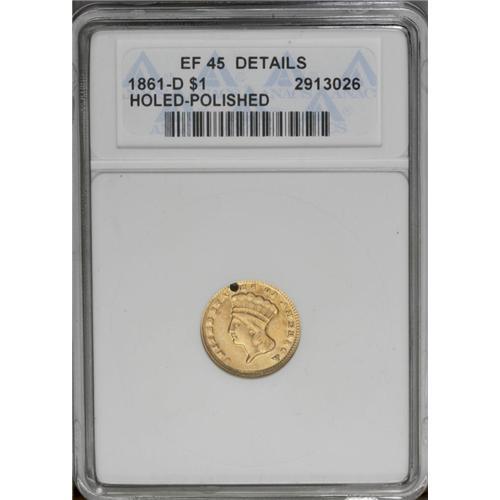 <B>1861-D G$1 --Holed, Polished--ANACS. XF45 Details.</B></I> Variety 12-Q. The rarest Dahlonega gold dollar, with only 55 to 65 pieces estimated in all grades. Collectors prize even a troubled example such as this. A hole near the second T in STATES just misses the mintmark on the reverse.<BR><BR><b>Shipping:</b> Coin/Currency (<a target="_blank" href="http://www.heritageauctions.com/common/shipping.php">view shipping information</a>)