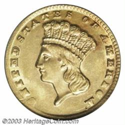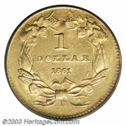 <table><tr><td><TABLE cellSpacing=0 cellPadding=0 width="100%" bgColor=#000000 border=0><TBODY> <TR><TD width="100%"><TABLE cellSpacing=1 cellPadding=3 width="100%" border=0><TBODY><TR><TD width="100%" bgColor=#79735c><FONT face=arial color=#ffffff size=3><B>Description</B> </FONT></TD></TR><TR><TD width="100%" bgColor=#ffffff><FONT face=arial size=2><B>1861-D G$1 MS61 PCGS.</B></I> Winter 12-O, First Edition. A historic rarity that was actually produced by the Confederate States of America after the Dahlonega Mint was seized in the spring of 1861. The exact mintage is unknown, but is often estimated to be between 1,000 and 1,500 pieces. Aside from its historical significance, the '61-D is also the most elusive D-mint Gold Dollar in terms of overall availability. Very few pieces have survived in Mint State condition, being perhaps limited to a dozen or so coins. Offered here is one of the more attractive representatives that we have seen. The obverse is diagnostically blunt on the U in UNITED and shows occasional softness on several other peripheral letters, while the reverse is quite well defined over the major devices. Only the denticles from 9 o'clock to 2 o'clock are indistinct. Close examination reveals a pinpoint depression after the final A in AMERICA and two other microscopic marks at the top of the wreath. Both the coloration and luster are nothing short of outstanding. Of the greatest importance to the Southern gold specialist. Population: 4 in 61, 9 finer (10/03). </FONT></TD></TR></TBODY></TABLE></TD></TR></TBODY></TABLE><BR><A name=PricesRealized></A><TABLE cellSpacing=0 cellPadding=0 width="100%" bgColor=#000000 border=0><TBODY><TR><TD width="100%"><TABLE cellSpacing=1 cellPadding=3 width="100%" border=0><TBODY><TR><TD width="100%" bgColor=#79735c><A name=PR><FONT face=arial color=#ffffff size=3><B>Previous Prices from Heritage Auctions</B> </FONT></A></TD></TR><TR><TD bgColor=#f6f6ed><TABLE cellSpacing=0 cellPadding=0 width="100%" border=1><TBODY><TR><TD align=middle width="33%"><B>Date</B></TD><TD align=middle width="33%"><B>Service</B></TD><TD align=middle width="33%"><B>Price</B></TD></TR><TR bgColor=whitesmoke><TD width="33%"><B>01/08/1999</B></TD><TD width="33%">PCGS</TD><TD width="33%">$31,050.00</TD></TR></TBODY></TABLE></TD></TR><TR><TD bgColor=#ffffff><FONT face=arial size=1 ?>PLEASE NOTE: All prices realized reflect the final hammer price PLUS the buyer's premium in auctions that charge a buyer's premium. Each item has a notation at the top of the listing indicating whether that lot included a buyer's premium. Example: A item that sells with a final hammer price of $100 and a 20% buyer's premium will display with a price realized of $120. All information listed is intended to be as accurate as possible, but errors are possible. Please use this guide carefully and inform us of any inaccuracies. </FONT></TD></TR></TBODY></TABLE></TD></TR></TBODY></TABLE><BR><TABLE cellSpacing=0 cellPadding=0 width="100%" bgColor=#000000 border=0><TBODY><TR><TD width="100%"><TABLE cellSpacing=1 cellPadding=3 width="100%" border=0><TBODY><TR><TD width="100%" bgColor=#79735c colSpan=6><FONT face=arial color=#ffffff size=3><B>Price Guide*</B> </FONT></TD></TR><TR bgColor=#f6f6ed><TD align=middle><B>Grade</B> </TD><TD align=middle><B>Coin World<BR>(Trends)</B> </TD><TD align=middle><B>Numismedia<BR>Retail</B> </TD><TD align=middle><B>Numismedia<BR>Wholesale</B> </TD><TD align=middle><B>Coin<BR>Universe</B> </TD><TD align=middle><B>Heritage<BR>Value Index</B> </TD></TR><TR bgColor=#ffffff><TD align=middle>60</TD><TD align=right>$35,000.00</TD><TD align=right>---</TD><TD align=right>$28,500.00</TD><TD align=right>$39,500.00</TD><TD align=right>$24,283.33</TD></TR><TR style="FONT-WEIGHT: bold" bgColor=#cccfdd><TD align=middle>61</TD><TD align=right>---</TD><TD align=right>---</TD><TD align=right>$30,000.00</TD><TD align=right>---</TD><TD align=right>$30,025.00</TD></TR><TR bgColor=#ffffff><TD align=middle>62</TD><TD align=right>$50,000.00</TD><TD align=right>---</TD><TD align=right>$33,350.00</TD><TD align=right>$48,000.00</TD><TD align=right>$35,766.67</TD></TR><TR bgColor=#ffffff><TD colSpan=6><FONT size=1>*All information listed is intended to be as accurate as possible, but errors are possible. No item may be returned or refused based on this information which is provided as a service to our customers. You should contact each pricing source directly to determine the accuracy of this information. </FONT></TD></TR></TBODY></TABLE></TD></TR></TBODY></TABLE><BR><TABLE cellSpacing=0 cellPadding=0 width="100%" bgColor=#000000 border=0><TBODY><TR><TD width="100%"><TABLE cellSpacing=1 cellPadding=3 width="100%" border=0><TBODY><TR><TD width="100%" bgColor=#79735c><FONT face=arial color=#ffffff size=3><B>Population Guide</B> </FONT></TD></TR><TR bgColor=#ffffff><TD align=middle><!-- Begin Output of Population Grid--><TABLE cellSpacing=0 cellPadding=0 width="100%" border=0><TBODY><TR><TD vAlign=center><TABLE cellSpacing=0 width="100%" border=1 cellsadding="3"><TBODY><TR><TD vAlign=center><TABLE cellSpacing=0 cellPadding=3 width="100%" border=1><TBODY><TR><TD vAlign=center align=middle bgColor=#f0f1e8 colSpan=2 <CENTER><FONT face=Arial size=2><B>PCGS Pop </B></FONT><CENTER></CENTER></TD><TD vAlign=center align=middle bgColor=#f0f1e8 colSpan=2><CENTER><FONT face=Arial size=2><B>NGC Pop</B></CENTER></FONT></TD></TR><TR><TD vAlign=center><FONT face=Arial size=2>(61)</FONT> </TD><TD vAlign=center align=right><FONT face=Arial size=2>4</FONT> </TD><TD vAlign=center><FONT face=Arial size=2>(61)</FONT> </TD><TD vAlign=center align=right><FONT face=Arial size=2>1</FONT> </TD></TR><TR><TD vAlign=center><FONT face=Arial size=2>(>61)</FONT> </TD><TD vAlign=center align=right><FONT face=Arial size=2>9</FONT> </TD><TD vAlign=center><FONT face=Arial size=2>(>61)</FONT> </TD><TD vAlign=center align=right><FONT face=Arial size=2>6</FONT> </TD></TR></TBODY></TABLE></TD></TR></TBODY></TABLE></TD></TR></TBODY></TABL