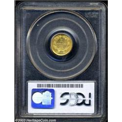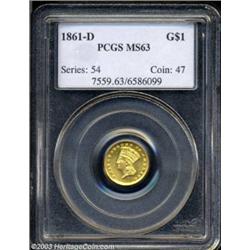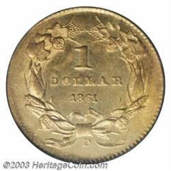 <table><tr><td><TABLE cellSpacing=0 cellPadding=0 width="100%" bgColor=#000000 border=0><TBODY> <TR><TD width="100%"><TABLE cellSpacing=1 cellPadding=3 width="100%" border=0><TBODY><TR><TD width="100%" bgColor=#79735c><FONT face=arial color=#ffffff size=3><B>Description</B> </FONT></TD></TR><TR><TD width="100%" bgColor=#ffffff><FONT face=arial size=2><B>1861-D G$1 MS63 PCGS.</B></I> Winter 12-O, First Edition. The 1861-D gold dollar is a high visibility coin whose fame is known far beyond collectors of gold dollars. According to Breen (1988), there were no gold dollars struck under Union authority, making the '61-D is a transcendent rarity. While only 50-55 pieces are known in all grades, and its absolute rarity is beyond dispute, there are a surprising number of high grade examples extant. Such a statement must, of course, be taken in context as only six other pieces have been graded in MS 63 by both major services with only one finer (8/03).<BR>As with all 1861-D gold dollars, the U in UNITED is very weak. The surfaces of this coin are quite extraordinary. The fields are bright and combine a semi-prooflike sheen with some cartwheel luster as well, similar to the finish seen on many three dollar gold pieces. This semi-prooflikeness was achieved by a mint employee who roughly polished the dies. Evidence of this can be seen on the lower part of the wreath, the bow, and ribbons, some portions of which are attenuated or detached. Both sides are very clean for a coin of this grade and a light bit of reddish patina gives the coin added character. Unquestionably, a coin for an advanced collector, and a coin that will most likely eventually be placed in one of the finer collections of Southern gold being formed. </FONT></TD></TR></TBODY></TABLE></TD></TR></TBODY></TABLE><BR><A name=PricesRealized></A><TABLE cellSpacing=0 cellPadding=0 width="100%" bgColor=#000000 border=0><TBODY><TR><TD width="100%"><TABLE cellSpacing=1 cellPadding=3 width="100%" border=0><TBODY><TR><TD width="100%" bgColor=#79735c><A name=PR><FONT face=arial color=#ffffff size=3><B>Previous Prices from Heritage Auctions</B> </FONT></A></TD></TR><TR><TD bgColor=#f6f6ed><TABLE cellSpacing=0 cellPadding=0 width="100%" border=1><TBODY><TR><TD align=middle width="33%"><B>Date</B></TD><TD align=middle width="33%"><B>Service</B></TD><TD align=middle width="33%"><B>Price</B></TD></TR><TR bgColor=whitesmoke><TD width="33%"><B>06/01/2000</B></TD><TD width="33%">NGC</TD><TD width="33%">$39,100.00</TD></TR></TBODY></TABLE></TD></TR><TR><TD bgColor=#ffffff><FONT face=arial size=1 ?>PLEASE NOTE: All prices realized reflect the final hammer price PLUS the buyer's premium in auctions that charge a buyer's premium. Each item has a notation at the top of the listing indicating whether that lot included a buyer's premium. Example: A item that sells with a final hammer price of $100 and a 20% buyer's premium will display with a price realized of $120. All information listed is intended to be as accurate as possible, but errors are possible. Please use this guide carefully and inform us of any inaccuracies. </FONT></TD></TR></TBODY></TABLE></TD></TR></TBODY></TABLE><BR><TABLE cellSpacing=0 cellPadding=0 width="100%" bgColor=#000000 border=0><TBODY><TR><TD width="100%"><TABLE cellSpacing=1 cellPadding=3 width="100%" border=0><TBODY><TR><TD width="100%" bgColor=#79735c colSpan=6><FONT face=arial color=#ffffff size=3><B>Price Guide*</B> </FONT></TD></TR><TR bgColor=#f6f6ed><TD align=middle><B>Grade</B> </TD><TD align=middle><B>Coin World<BR>(Trends)</B> </TD><TD align=middle><B>Numismedia<BR>Retail</B> </TD><TD align=middle><B>Numismedia<BR>Wholesale</B> </TD><TD align=middle><B>Coin<BR>Universe</B> </TD><TD align=middle><B>Heritage<BR>Value Index</B> </TD></TR><TR bgColor=#ffffff><TD align=middle>62</TD><TD align=right>$50,000.00</TD><TD align=right>---</TD><TD align=right>$33,350.00</TD><TD align=right>$48,000.00</TD><TD align=right>$35,766.67</TD></TR><TR style="FONT-WEIGHT: bold" bgColor=#cccfdd><TD align=middle>63</TD><TD align=right>$75,000.00</TD><TD align=right>---</TD><TD align=right>$54,500.00</TD><TD align=right>$70,000.00</TD><TD align=right>$55,800.00</TD></TR><TR bgColor=#ffffff><TD align=middle>64</TD><TD align=right>$100,000.00</TD><TD align=right>---</TD><TD align=right>$82,500.00</TD><TD align=right>---</TD><TD align=right>$67,625.00</TD></TR><TR bgColor=#ffffff><TD colSpan=6><FONT size=1>*All information listed is intended to be as accurate as possible, but errors are possible. No item may be returned or refused based on this information which is provided as a service to our customers. You should contact each pricing source directly to determine the accuracy of this information. </FONT></TD></TR></TBODY></TABLE></TD></TR></TBODY></TABLE><BR><TABLE cellSpacing=0 cellPadding=0 width="100%" bgColor=#000000 border=0><TBODY><TR><TD width="100%"><TABLE cellSpacing=1 cellPadding=3 width="100%" border=0><TBODY><TR><TD width="100%" bgColor=#79735c><FONT face=arial color=#ffffff size=3><B>Population Guide</B> </FONT></TD></TR><TR bgColor=#ffffff><TD align=middle><!-- Begin Output of Population Grid--><TABLE cellSpacing=0 cellPadding=0 width="100%" border=0><TBODY><TR><TD vAlign=center><TABLE cellSpacing=0 width="100%" border=1 cellsadding="3"><TBODY><TR><TD vAlign=center><TABLE cellSpacing=0 cellPadding=3 width="100%" border=1><TBODY><TR><TD vAlign=center align=middle bgColor=#f0f1e8 colSpan=2 <CENTER><FONT face=Arial size=2><B>PCGS Pop </B></FONT><CENTER></CENTER></TD><TD vAlign=center align=middle bgColor=#f0f1e8 colSpan=2><CENTER><FONT face=Arial size=2><B>NGC Pop</B></CENTER></FONT></TD></TR><TR><TD vAlign=center><FONT face=Arial size=2>(63)</FONT> </TD><TD vAlign=center align=right><FONT face=Arial size=2>5</FONT> </TD><TD vAlign=center><FONT face=Arial size=2>(63)</FONT> </TD><TD vAlign=center align=right><FONT face=Arial size=2>2</FONT> </TD></TR><TR><TD vAlign=center><FONT face=Arial size=2>(>63)</FONT> </TD><TD vAlign=center align=r