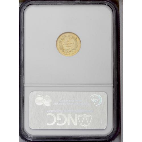 <B>1861-D<G$1> MS65 NGC.</B></I> Variety 12-Q. The only dies of the year. The obverse die is the same as on the 1860-D. On the reverse, the date is small and positioned somewhat to the left.<BR> The 1861-D is the rarest and most famous gold dollar from this mint. It is also the single most coveted coin from Dahlonega, as it is the only regular issue that was produced entirely by the Confederacy. After the Mint was seized in April 1861, between 1,000 and 1,500 examples were struck by Rebel forces. It is unlikely that more than five to six dozen are known today. Interestingly, more of these exist in high grade than one might expect, and there are probably more than a dozen pieces in Uncirculated. This is almost certainly due to the fact that examples were saved as souvenirs.<BR> This issue has a very distinct appearance that contributes in part to the charm of the 1861-D gold dollar. It is always found with a weak strike on the obverse, and this example is no exception. The UN in UNITED is weak, but these letters are actually more distinct than usual. The IC in AMERICA is also weak but, again, they are more fully defined than on nearly any other example of the 1861-D gold dollar we have seen. There is also some weakness on the left side of the denticles; this is diagnostic for the issue. The reverse is remarkable and probably has the fullest strike we have seen on an 1861-D. The date and mintmark are full, while the word DOLLAR is complete except for the O, which shows some softness. There are multiple clash marks present--heaviest near the R in DOLLAR. These clash marks can also be seen along the portrait on the obverse but they are not as strong in this area. Some of the field near the left side of the portrait is semi-reflective, this is likely a result of mint personnel attempting to remove the clash marks. The surfaces of this coin are very clean and suggest that it has been carefully preserved since it was produced almost 150 years ago. There is one tiny, shallow tick in the left obverse field and another shallow, unobtrusive mark on Liberty's cheek. These serve as excellent identifiers for future pedigree information. The luster that this piece shows is exceptional. It seems to "drip" off the surfaces and is far above average for a date that, surprisingly, can be found with good luster. The obverse is graced by rich orange-gold color, with some steel highlights in the center and toward the edge; the reverse is slightly lighter and deepens to an olive hue at the border.<BR> There are three really great 1861-D gold dollars known: the Ullmer-Pierce coin (graded MS64 by PCGS), currently in an Alabama collection; the Green Pond/Eliasberg coin (graded MS63 by PCGS), last sold by Heritage in January 2004; and the Duke's Creek coin, which is the presently offered specimen. We would not be surprised to see this coin set an all-time record for a Dahlonega gold coin, given the demand for rare coins with great stories.<BR><I>Ex: Dr. Philip Weinstein; Superior (1/89), lot 274, where it brought $24,200; Tony Terranova; Stack's (1/90), lot 1594, where it realized $31,900; Leon Farmer Collection; Hancock and Harwell. This is the plate coin in the first edition of</B></I> Gold Coins of the Dahlonega Mint, 1838-1861.<BR><I>From The Duke's Creek Collection of Dahlonega Gold.</B></I>