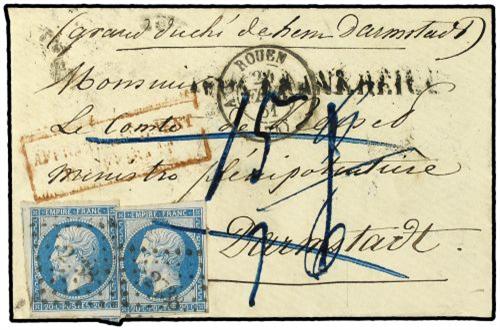 1861 Envelope to Darmstadt franked imperf 20c. Napoleon(2) tied by numeral cancel of Rouen. Obverse bears red boxed "Affranchissement/Insuffisant" + black s/l "Aus Frankreich". On reverse, Paris & Frankfurt transit cds.