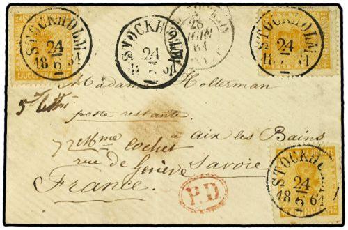 1861 Envelope to FRANCE bearing 24 ore yellow orange (3) (Facit 10) tied by STOCKHOLM datestamp with oval PD, French entry cachet and SAVOIE arrival on reverse. Very fine.