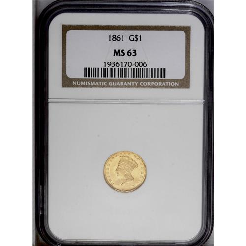 1861 G$1 MS63 NGC. Select and slightly brassy, this co