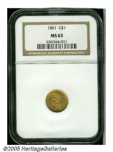 <B>1861<G$1> MS63 NGC.</B></I> Sharply struck with mildly prooflike fields and pleasing pastel pink and green coloration. There are a few wispy marks on the reverse that influence the assigned grade, but the obverse seems abrasion-free. Popular Civil War date.