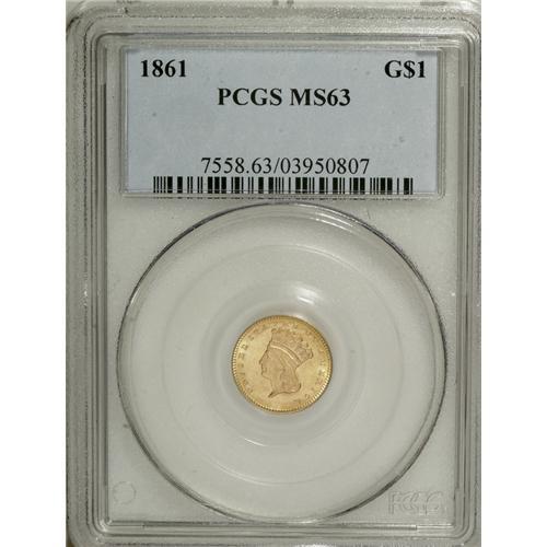1861 G$1 MS63 PCGS. This boldly struck Civil War gold
