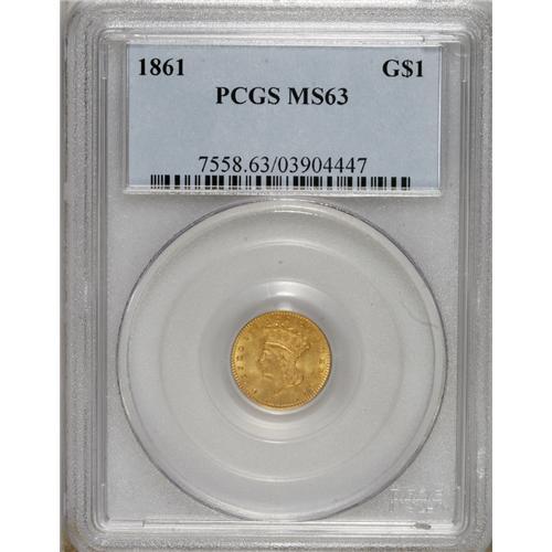 <B>1861 G$1 MS63 PCGS.</B></I> This is a very pleasing gold dollar that has much to recommend it. The surfaces are smoother and less abraded than usual, for the MS63 level, and there are no die clash marks on either side of the piece. Shimmering luster and light yellow-gold coloration are also quite attractive. Only a shallow pinscratch in the obverse exergue prevents a finer grade assessment.<BR><BR><b>Shipping:</b> Coins & Currency (<a target="_blank" href="http://www.heritageauctions.com/common/shipping.php">view shipping information</a>)