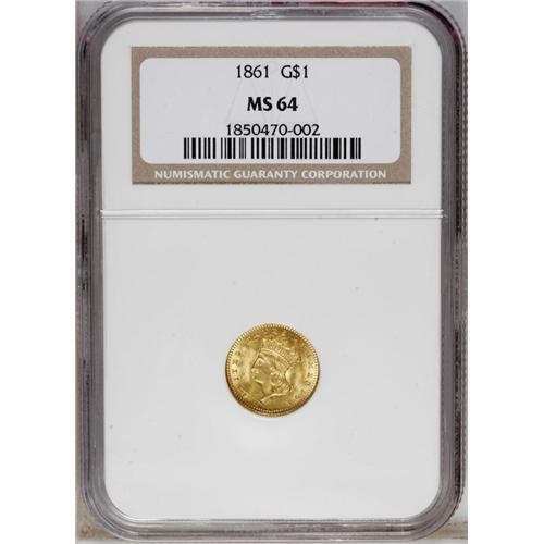 <B>1861<G$1> MS64 NGC.</B></I> A lustrous yellow-gold example with a shiny patch beneath the bust. Generally well struck, though slight flatness is noted on the leaves.