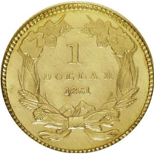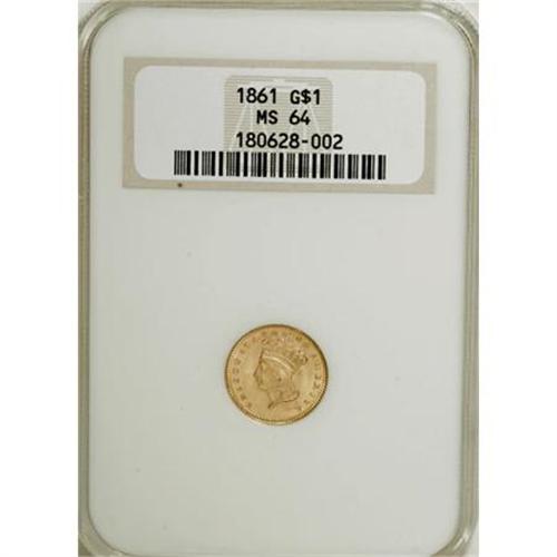 <B>1861 G$1 MS64 NGC.</B></I> NGC Census: (106/37). PCGS Population (82/37). Mintage: 527,499. Numismedia Wsl. Price for NGC/PCGS coin in MS64: $1,225. (#7558)<BR><BR><B>Coin Engraver:</B> James B. Longacre<BR><BR><b>Shipping:</b> Coins & Currency (<a target="_blank" href="http://www.heritageauctions.com/common/shipping.php">view shipping information</a>)