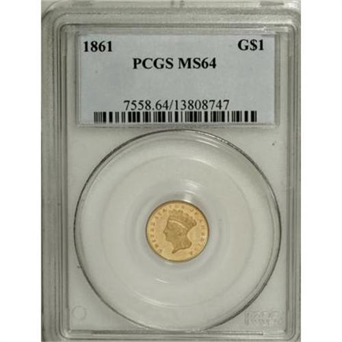 <B>1861 G$1 MS64 PCGS.</B></I> Boldly detailed with noticeably striated fields and frosty devices. While not among the scarcest dates in the series at the MS64 grade level, the Civil War connection for this year causes demand to far outstrip the relatively limited supply.<BR><BR><B>Coin Engraver:</B> James B. Longacre<BR><BR><b>Shipping:</b> Coins & Currency (<a target="_blank" href="http://www.heritageauctions.com/common/shipping.php">view shipping information</a>\)