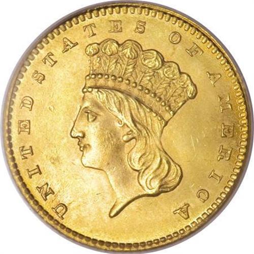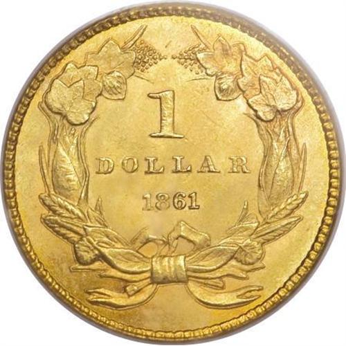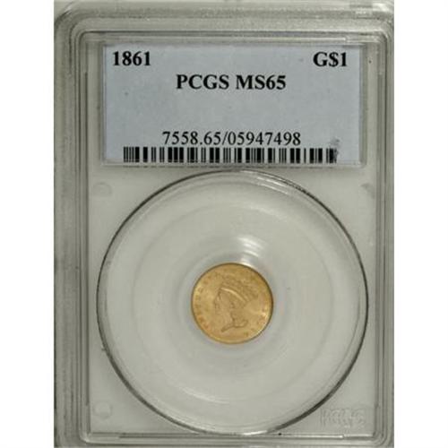 <B>1861 G$1 MS65 PCGS.</B></I> This issue is very scarce at the Gem grade level, even though lower Mint State examples are relatively common through MS63. This example is well struck, and all the letters of LIBERTY are clearly defined. Clash marks are not noticeable on either side, which is somewhat unusual. This satiny piece is carefully preserved overall, with just a few scratchy marks evident on the lower left obverse, near UN. Population: 27 in 65, 9 finer (7/07). <BR><BR><B>Coin Engraver:</B> James B. Longacre<BR><BR><b>Shipping:</b> Coins & Currency (<a target="_blank" href="http://www.heritageauctions.com/common/shipping.php">view shipping information</a>\)