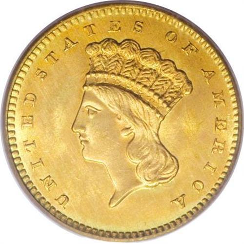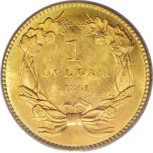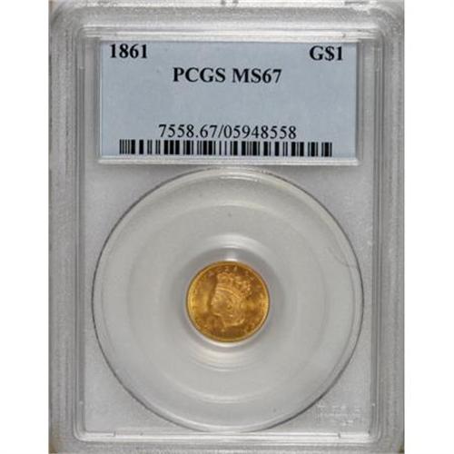 <B>1861 G$1 MS67 PCGS.</B></I> The mintage for the 1861 gold dollar exceeded half a million pieces, the first issue to have such a high mintage since 1857. This generous production has made the 1861 popular with type collectors, and in lower Mint State grades, examples are common. Unlike the later issues of the 1880s, however, Gems are only occasionally available, and NGC and PCGS combined have certified just three coins in MS67, with the representative offered here the <I>only</B></I> such piece graded by the latter firm (5/07).<BR> This sharply struck beauty has a breathtaking appearance. The obverse has vivid sun-gold color tempered by orange at the margins, while the reverse has vibrant butter-yellow color. Strong, though not flashy luster enhances the warm tones of the surfaces and emphasizes the near-perfect preservation of the piece. A wonderful, entrancing example of this Civil War issue.<BR><BR><b>Shipping:</b> Coins & Currency (<a target="_blank" href="http://www.heritageauctions.com/common/shipping.php">view shipping information</a>)