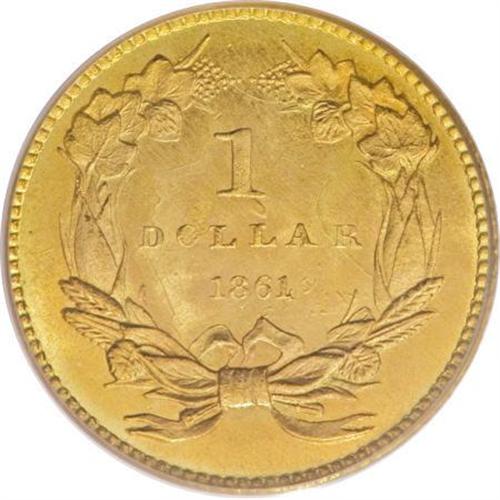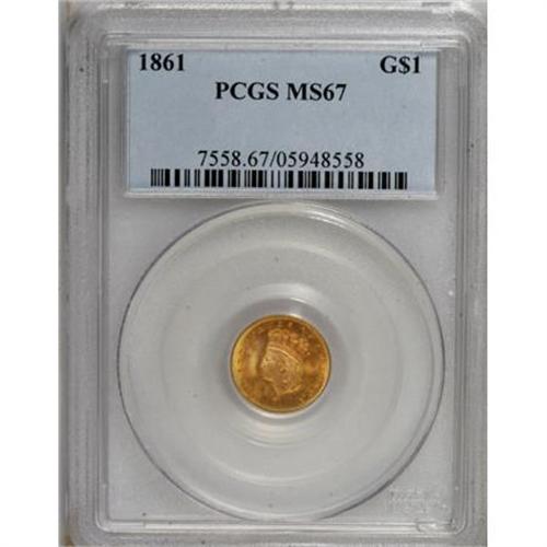 <B>1861 G$1 MS67 PCGS.</B></I> The mintage for the 1861 gold dollar exceeded half a million pieces, the first issue to have such a high mintage since 1857. This generous production has made the 1861 popular with type collectors, and in lower Mint State grades, examples are common. Unlike the later issues of the 1880s, however, Gems are only occasionally available, and NGC and PCGS combined have certified just four Superb Gems, two each at NGC and PCGS (9/07).<BR> This sharply struck beauty has a breathtaking appearance. The obverse has vivid sun-gold color tempered by orange at the margins, while the reverse has vibrant butter-yellow color. Strong, though not flashy luster enhances the warm tones of the surfaces and emphasizes the near-perfect preservation of the piece. A wonderful, entrancing example of this Civil War issue.<BR><BR><B>Coin Engraver:</B> James B. Longacre<BR><BR><b>Shipping:</b> Coins & Currency (<a target="_blank" href="http://www.heritageauctions.com/common/shipping.php">view shipping information</a>)