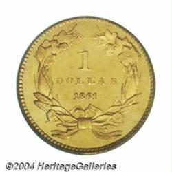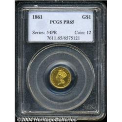 <table><tbody><tr><td><table> <TR><TD width="100%"><TABLE cellSpacing=1 cellPadding=3 width="100%" border=0><TBODY><TR><TD width="100%" bgColor=#79735c><FONT face=arial color=#ffffff size=3><B>Description</B> </FONT></TD></TR><TR><TD width="100%" bgColor=#ffffff><FONT face=arial size=2><B>1861 G$1 PR65 PCGS.</B></I> Even though 349 proofs were reported minted, it is obvious that the vast majority were melted, as with most of the other denominations struck in this year. It appears that today fewer than three dozen proofs survive in all grades, and perhaps as few as two dozen. This is a deeply reflective piece that has a modest amount of frost on the devices. There are virtually no contact marks on either side, just a few tiny lint marks that were struck into the planchet after the dies were wiped with a soft cloth. Population: 11 in 65, 1 finer (10/03). </FONT></TD></TR></TBODY></TABLE></TD></TR></TBODY></TABLE><BR><A name=PricesRealized></A><TABLE cellSpacing=0 cellPadding=0 width="100%" bgColor=#000000 border=0><TBODY><TR><TD width="100%"><TABLE cellSpacing=1 cellPadding=3 width="100%" border=0><TBODY><TR><TD width="100%" bgColor=#79735c><A name=PR><FONT face=arial color=#ffffff size=3><B>Previous Prices from Heritage Auctions</B> </FONT></A></TD></TR><TR><TD bgColor=#f6f6ed><TABLE cellSpacing=0 cellPadding=0 width="100%" border=1><TBODY><TR><TD align=middle width="33%"><B>Date</B></TD><TD align=middle width="33%"><B>Service</B></TD><TD align=middle width="33%"><B>Price</B></TD></TR><TR bgColor=whitesmoke><TD width="33%"><B>11/01/1997</B></TD><TD width="33%">PCGS</TD><TD width="33%">$14,300.00</TD></TR></TBODY></TABLE></TD></TR><TR><TD bgColor=#ffffff><FONT face=arial size=1 ?>PLEASE NOTE: All prices realized reflect the final hammer price PLUS the buyer's premium in auctions that charge a buyer's premium. Each item has a notation at the top of the listing indicating whether that lot included a buyer's premium. Example: A item that sells with a final hammer price of $100 and a 20% buyer's premium will display with a price realized of $120. All information listed is intended to be as accurate as possible, but errors are possible. Please use this guide carefully and inform us of any inaccuracies. </FONT></TD></TR></TBODY></TABLE></TD></TR></TBODY></TABLE><BR><TABLE cellSpacing=0 cellPadding=0 width="100%" bgColor=#000000 border=0><TBODY><TR><TD width="100%"><TABLE cellSpacing=1 cellPadding=3 width="100%" border=0><TBODY><TR><TD width="100%" bgColor=#79735c colSpan=6><FONT face=arial color=#ffffff size=3><B>Price Guide*</B> </FONT></TD></TR><TR bgColor=#f6f6ed><TD align=middle><B>Grade</B> </TD><TD align=middle><B>Coin World<BR>(Trends)</B> </TD><TD align=middle><B>Numismedia<BR>Retail</B> </TD><TD align=middle><B>Numismedia<BR>Wholesale</B> </TD><TD align=middle><B>Coin<BR>Universe</B> </TD><TD align=middle><B>Heritage<BR>Value Index</B> </TD></TR><TR bgColor=#ffffff><TD align=middle>64</TD><TD align=right>---</TD><TD align=right>---</TD><TD align=right>$10,925.00</TD><TD align=right>$8,650.00</TD><TD align=right>$5,907.50</TD></TR><TR style="FONT-WEIGHT: bold" bgColor=#cccfdd><TD align=middle>65</TD><TD align=right>---</TD><TD align=right>---</TD><TD align=right>$12,250.00</TD><TD align=right>$16,900.00</TD><TD align=right>$10,865.00</TD></TR><TR bgColor=#ffffff><TD align=middle>66</TD><TD align=right>---</TD><TD align=right>---</TD><TD align=right>$16,775.00</TD><TD align=right>---</TD><TD align=right>---</TD></TR><TR bgColor=#ffffff><TD colSpan=6><FONT size=1>*All information listed is intended to be as accurate as possible, but errors are possible. No item may be returned or refused based on this information which is provided as a service to our customers. You should contact each pricing source directly to determine the accuracy of this information. </FONT></TD></TR></TBODY></TABLE></TD></TR></TBODY></TABLE><BR><TABLE cellSpacing=0 cellPadding=0 width="100%" bgColor=#000000 border=0><TBODY><TR><TD width="100%"><TABLE cellSpacing=1 cellPadding=3 width="100%" border=0><TBODY><TR><TD width="100%" bgColor=#79735c><FONT face=arial color=#ffffff size=3><B>Population Guide</B> </FONT></TD></TR><TR bgColor=#ffffff><TD align=middle><!-- Begin Output of Population Grid--><TABLE cellSpacing=0 cellPadding=0 width="100%" border=0><TBODY><TR><TD vAlign=center><TABLE cellSpacing=0 width="100%" border=1 cellsadding="3"><TBODY><TR><TD vAlign=center><TABLE cellSpacing=0 cellPadding=3 width="100%" border=1><TBODY><TR><TD vAlign=center align=middle bgColor=#f0f1e8 colSpan=2 <CENTER><FONT face=Arial size=2><B>PCGS Pop </B></FONT><CENTER></CENTER></TD><TD vAlign=center align=middle bgColor=#f0f1e8 colSpan=2><CENTER><FONT face=Arial size=2><B>NGC Pop</B></CENTER></FONT></TD></TR><TR><TD vAlign=center><FONT face=Arial size=2>(65)</FONT> </TD><TD vAlign=center align=right><FONT face=Arial size=2>11</FONT> </TD><TD vAlign=center><FONT face=Arial size=2>(65)</FONT> </TD><TD vAlign=center align=right><FONT face=Arial size=2>0</FONT> </TD></TR><TR><TD vAlign=center><FONT face=Arial size=2>(>65)</FONT> </TD><TD vAlign=center align=right><FONT face=Arial size=2>1</FONT> </TD><TD vAlign=center><FONT face=Arial size=2>(>65)</FONT> </TD><TD vAlign=center align=right><FONT face=Arial size=2>2</FONT> </TD></TR></TBODY></TABLE></TD></TR></TBODY></TABLE></TD></TR></TBODY></TABLE><!-- End Output of Population Grid--></TD></TR></TBODY></TABLE></TD></TR></TBODY></TABLE><BR><TABLE cellSpacing=0 cellPadding=0 width="100%" bgColor=#000000 border=0><TBODY><TR> <font color='#000000'><span style='background-color: #FFFFFF'><td bgcolor='#FFFFFE'> Important notice: Heritage usually auctions material at the rate of 200-250 lots per hour. On some occasions eBay Live bid software or the Internet may not be able to keep up with the pace of the auction. We recommend placing a realistic absentee bid now as insurance to avoid disappointment. Occasionally the auctioneer may eliminate or reject an eBay Live bid, and the auctioneer may also r