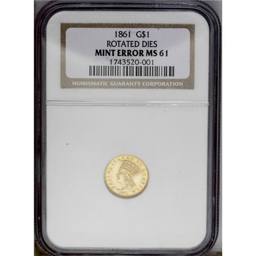 1861 G$1 --Rotated Dies--MS61 NGC. This sharply struck 1861[G$1]--Rotated Dies--MS61 NGC.